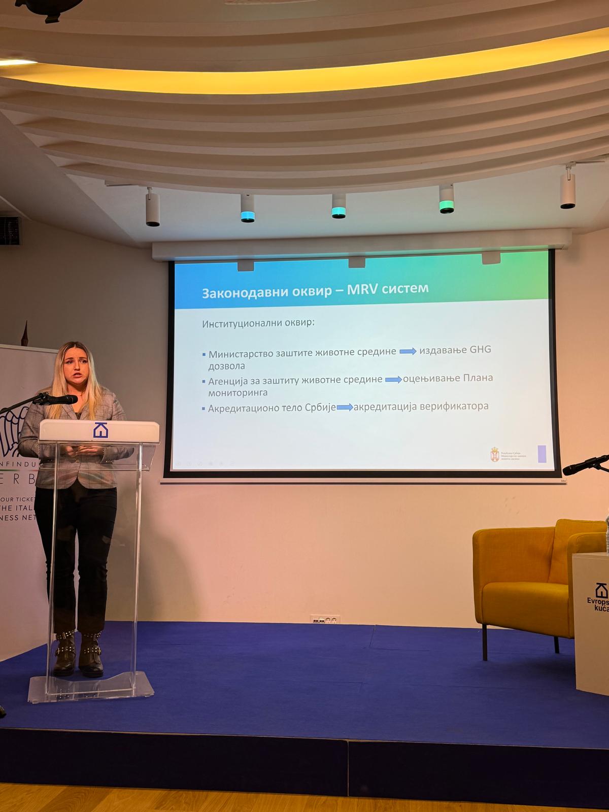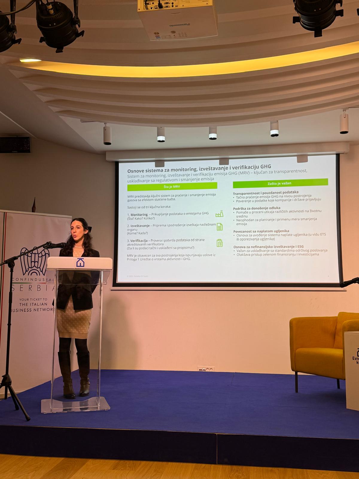 Usledilo je zatim izlaganje gđe Jelene Perović, ESG konsultantkinje ispred kompanije Deloitte, partnera ESG Laba, na temu: „Praktični vodič za kompanije – dozvole za emisiju gasova sa efektom staklene bašte i njihova povezanost sa CBAM-om“. Ovo izlaganje pružilo je konkretne uvide u zakonsku regulativu i njenu usklađenost sa evropskim standardima, ali je istaklo i praktične korake neophodne kako bi kompanija dobila GHG dozvolu.