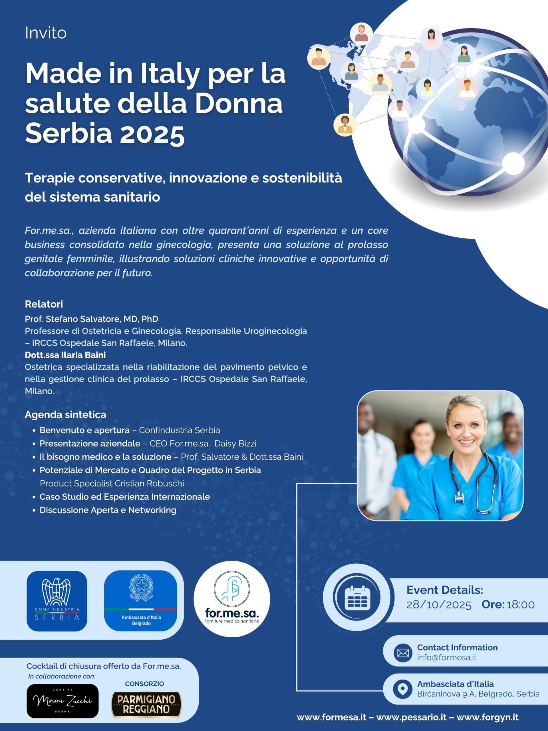 For.me.sa. Srl, azienda italiana con oltre quarant’anni di esperienza nel settore della salute femminile, in collaborazione con Confindustria Serbia e con l’Ambasciata d’Italia in Serbia vi invitano a partecipare a un evento esclusivo dedicato alle nuove tecnologie e ai dispositivi medicali che migliorano la qualità della vita delle donne.