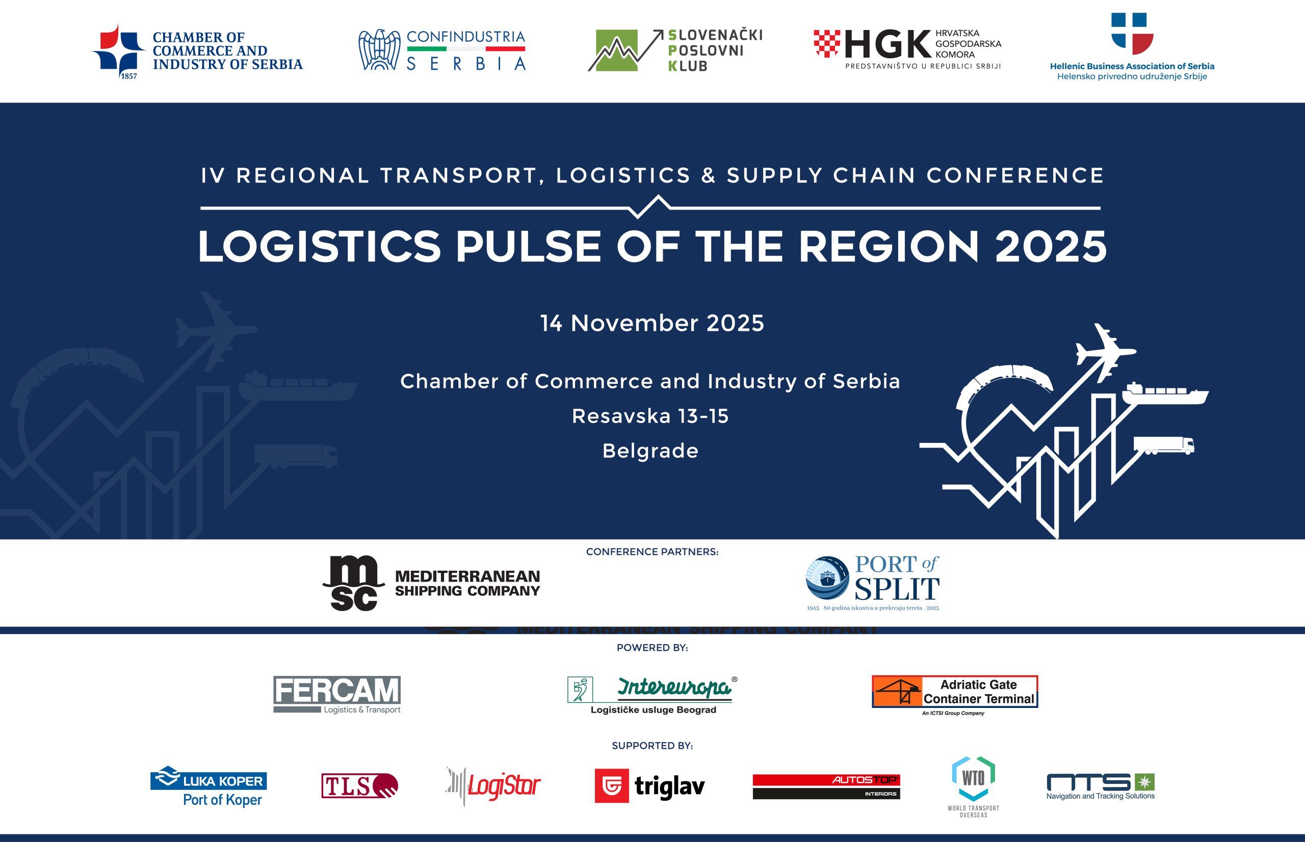 Konfindustrija Srbija, Privredna komora Srbije, Slovenački poslovni klub, Predstavništvo Hrvatske gospodarske komore u Srbiji i Helensko privredno udruženje Srbije sa zadovoljstvom Vas pozivaju da učestvujete na IV Regionalnoj konferenciji o transportu, logistici i lancima snabdevanja.
